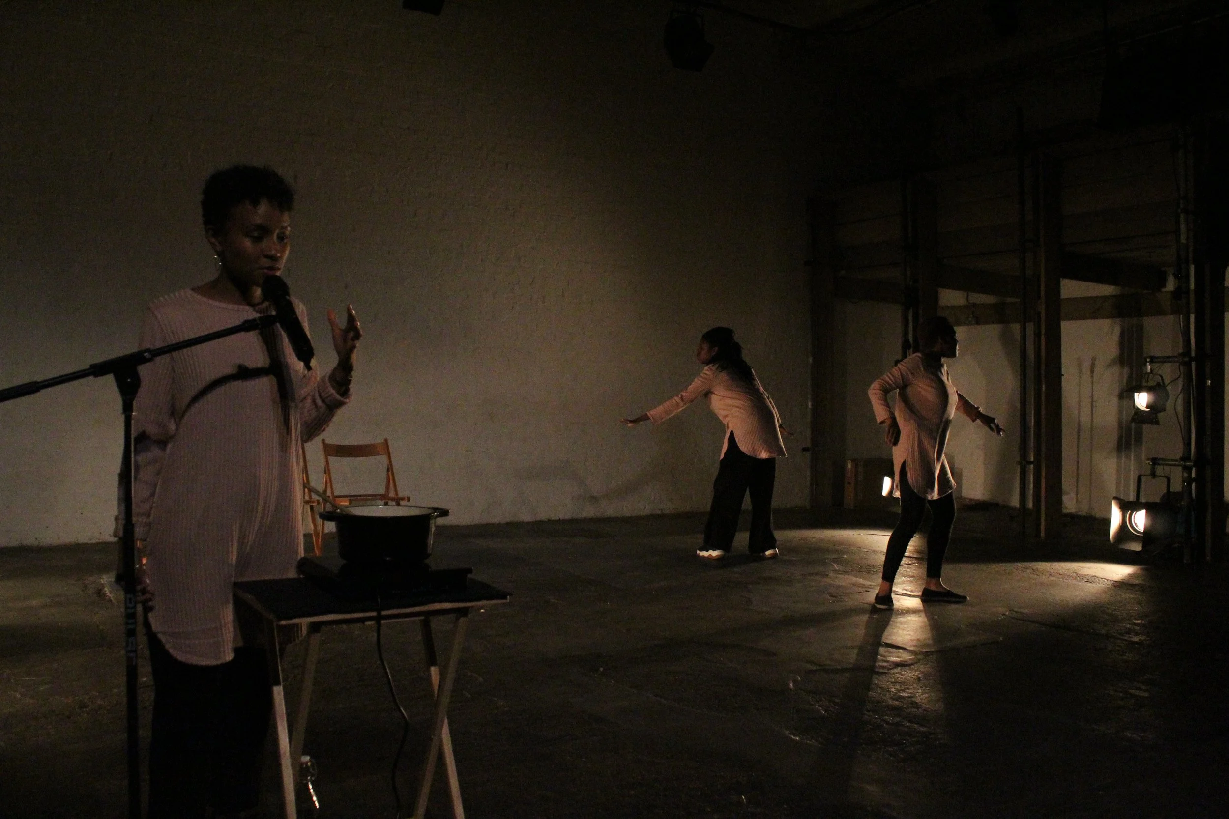We Owe You A Legacy was a tender and brutal examination of the role of the Mother figure in building a post colonial future for black women. It takes a look at how expectaion in black imigrant families is placed on the shoulders of the daughter. Using aural history, sisterhood and inherited cooking practices. The performance is a slow and reflective attempt to treat the mother and the daughter figures as mythical creatures in the space, where home is questioned and striving for a successful life is turned over by three figures in the space who feed the audience, address the audience and perform mundane rituals of nurture.